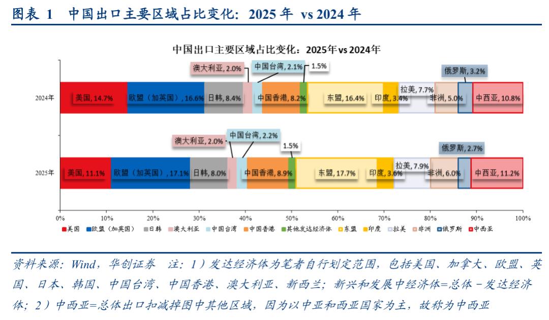 从区域占比变化来看,2025年出口新兴市场占比49.1%,较2024年提升约2.5pp(百分点,后文同);出口美国占比11.1%,较2024年回落约3.5pp;出口非美发达市场占比39.8%,较2024年提升约1pp。