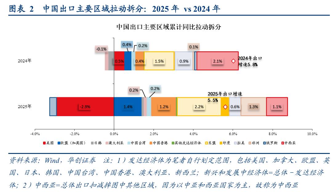 2025年,中国出口增长5.5%,比去年回落约0.3个点。从区域拉动来看,增长动能主要来自于新兴市场,包括东盟、非洲、中西亚、拉美、印度,合计拉动出口5.6%,较2024年提升0.9pp;发达市场剔除美国拉动3.2%,较2024年提升2.7pp;美国拖累-2.9%,较2024年回落3.5pp。