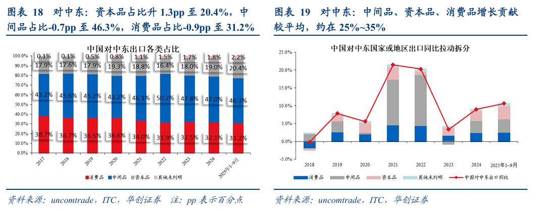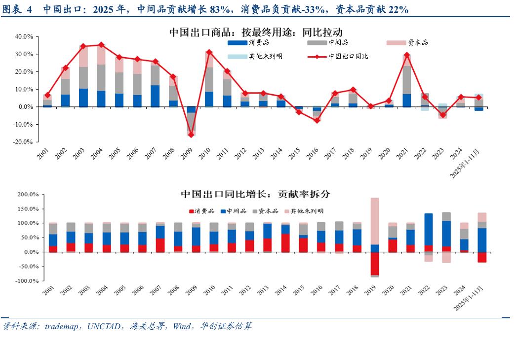 2)从对增速贡献来看,近年来中间品对出口增长的贡献率中枢抬升,消费品的增长贡献率中枢则趋势下滑,资本品的贡献率中枢基本持平。2018~2025年前11个月,中间品对出口增长的贡献率由55.8%升至85%,消费品的贡献率则由24.7%降至-34%,资本品的贡献率由19.4%小幅升至22.4%。