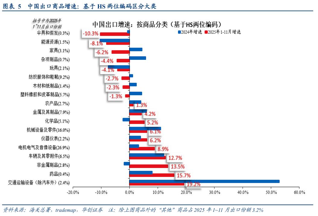 1)2025年出口偏强的是交通运输设备、药品、非金属制品、电机电气及音像设备、仪器仪表、机械设备及零件、化学品,前11个月累计出口同比增速超过5%;