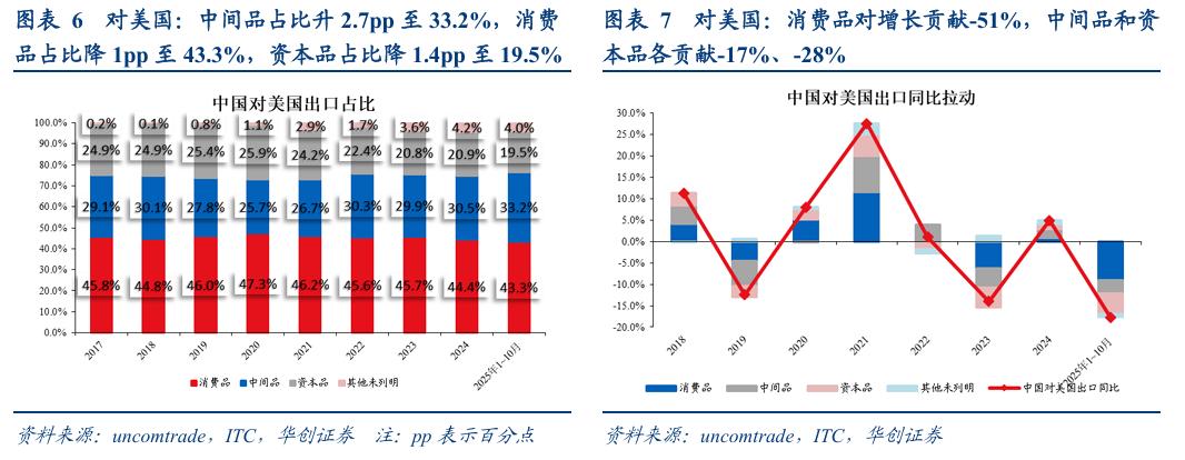 1)2017年以来,中国出口中间品占比震荡抬升,2025年升幅尤为显著,与此同时伴随着消费品占比的显著下滑。2017年~2025年前11个月,中国出口中间品占比由41.9%升至47.4%,年均提升0.7个点;消费品占比由36.6%降至28.7%,年均回落1个点左右;资本品占比由21.5%微幅降至20.1%,平均每年回落0.2个百分点左右,基本持稳。