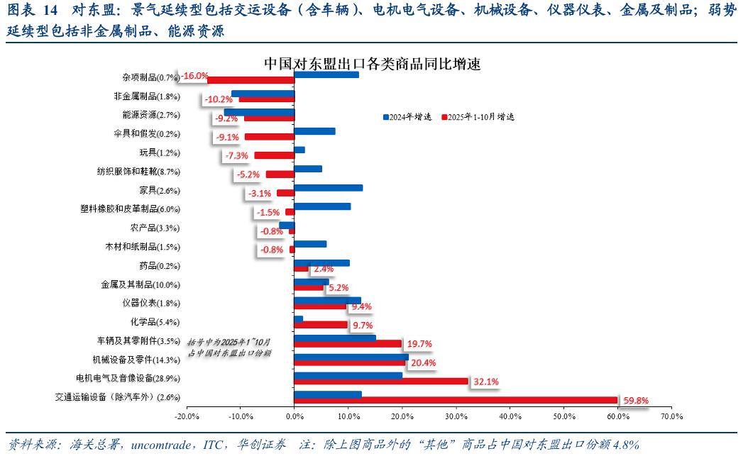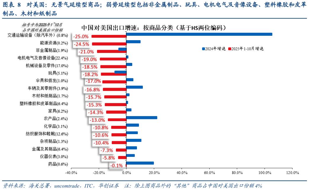 2)2025年出口偏弱的是伞具和假发、能源资源、家具、杂项制品、玩具、纺织服饰和鞋靴、木材和纸制品、塑料橡胶和皮革制品,前11个月出口增速为负。