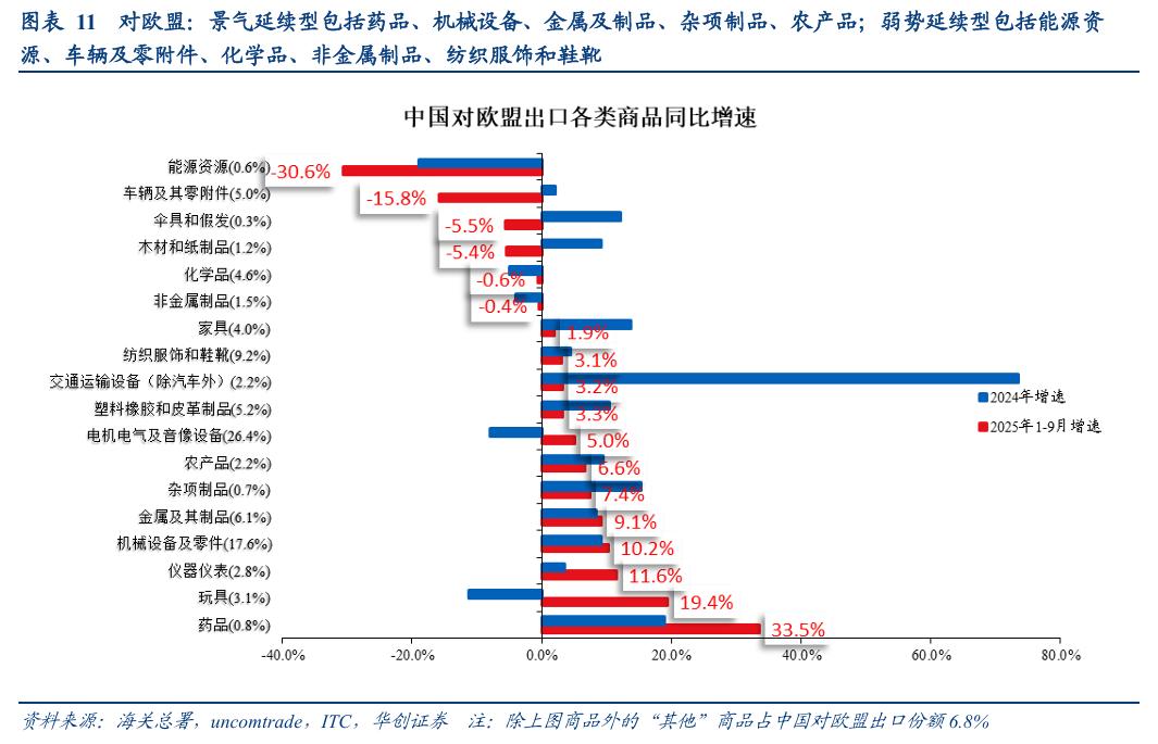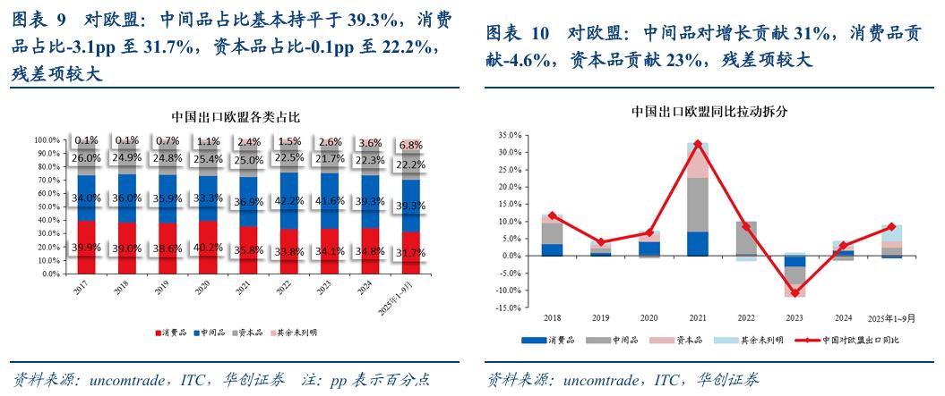 需要注意,按用途分,2024年、2025年1~9月中国对欧盟出口的残差项(其余未列明)较大,其中低值简易通关商品可能居多,因而可能低估了近两年消费品和中间品对增长的贡献。