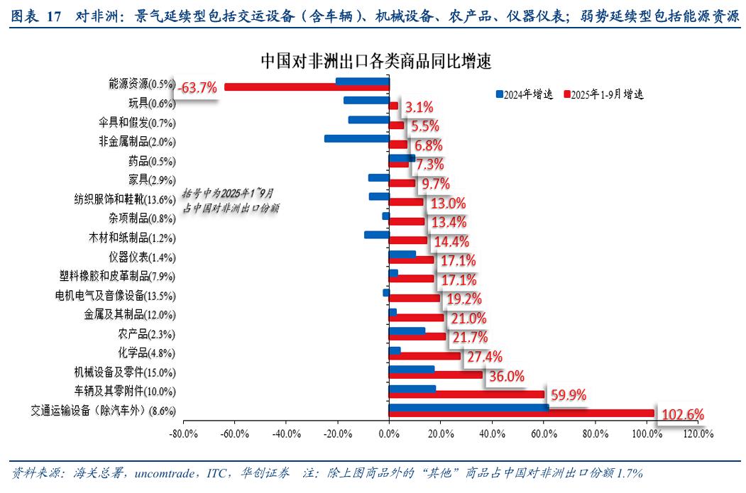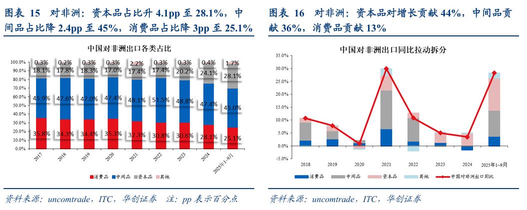 从区域拉动边际变化来看,增量贡献主要来自非洲、欧盟(加英国)、东盟和中国香港,2025年对中国出口拉动分别较2024年提升1.2pp、1.1pp、0.7pp、0.8pp,合计增量3.8pp,基本抵消了美国相比去年的拉动减弱(-3.5pp)。
