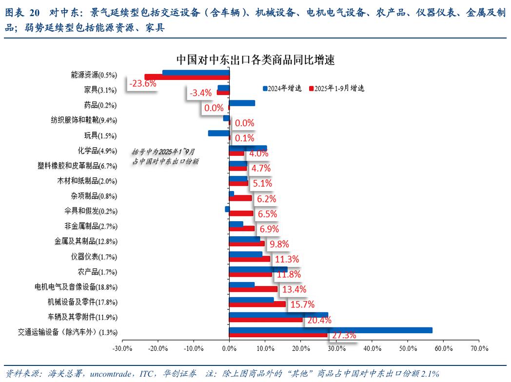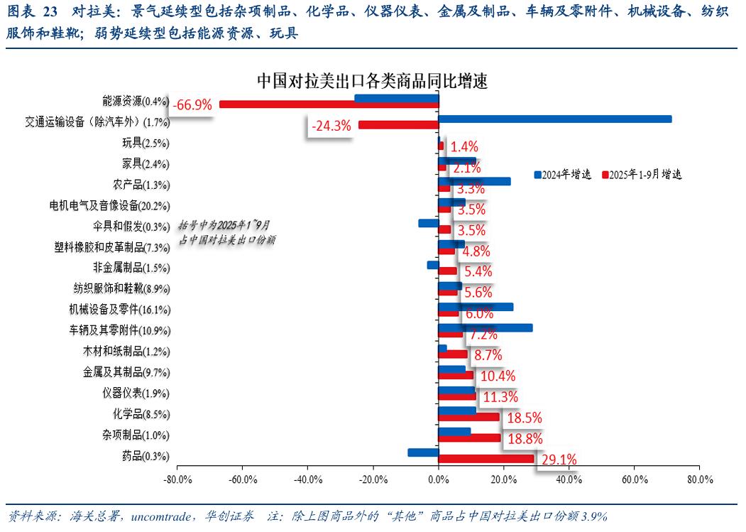 3)结合近两年(2024年、2025年1~11月)出口增速的表现,可以将商品分为四类:第一类是景气延续型商品,即近两年出口增速均高的品类,包括交通运输设备、药品、电机电气及音像设备、仪器仪表、机械设备及零件;第二类是困境反转型商品2024年出口表现不佳、2025年1~11月表现较好的品类,包括非金属制品、化学品。第三类是弱势延续型商品,即近两年出口增速均偏弱(负增或者明显低于整体出口增速),包括伞具和假发、能源资源、玩具;第四类是动能衰减型商品,即2024年出口表现好、但2025年1~11月表现不佳的品类,包括家具、杂项制品、纺织服饰和鞋靴、木材和纸制品、塑料橡胶和皮革产品。