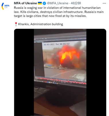 “俄罗斯发动战争违反了国际人道主义法。杀害平民,破坏民用基础设施。俄罗斯的主要目标是现在被导弹袭击的大城市,”乌克兰外交部周二在推特上分享了一段视频,视频显示哈尔科夫地区政府大楼遭到导弹袭击。推文还将地址标注为“哈尔科夫,行政大楼”。