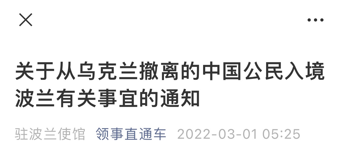 FX168财经报社(北美)讯 周二(3月1日),“领事直通车”微信公众号官方发布驻波兰使馆关于从乌克兰撤离的中国公民入境波兰有关事宜的通知: