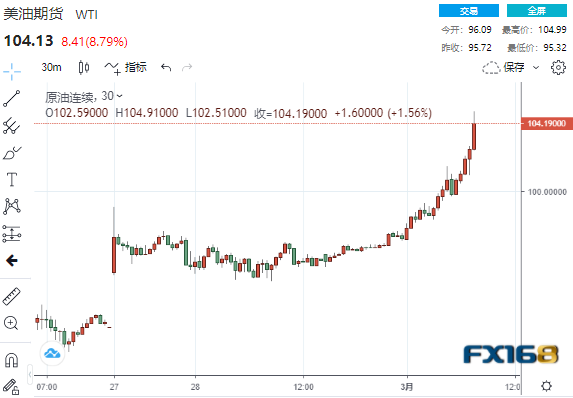 美市盘中,WTI原油日内暴涨超9.00%,触及104.99美元/桶高点,超过了2014年7月触及的102.19美元/桶水平。