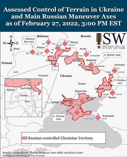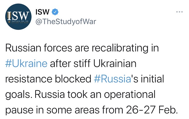 华盛顿智库战争研究所(ISW)表示,在乌克兰的顽强抵抗阻止了俄罗斯最初的目标后,俄罗斯军队正在重新调整在乌克兰的部署。俄罗斯军队2月26日至27日在一些地区暂停了行动。