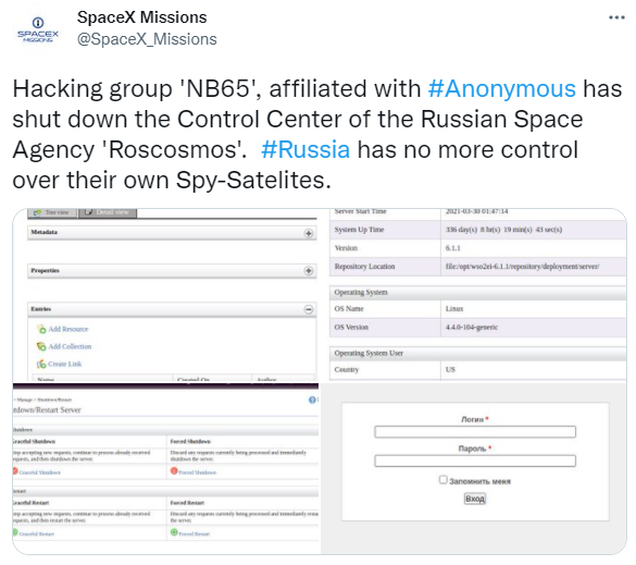 当前匿名者组织再通过推特宣布,匿名者旗下的分支骇客团队NB65,目前已经成功瘫痪俄罗斯航太的控制中心,目前俄罗斯已经无法与自己的间谍卫星取得联系与控制。NB65指出,“我们不会停手,直到你停止投掷炸弹、杀害平民和试图入侵的那刻,滚回俄罗斯。”