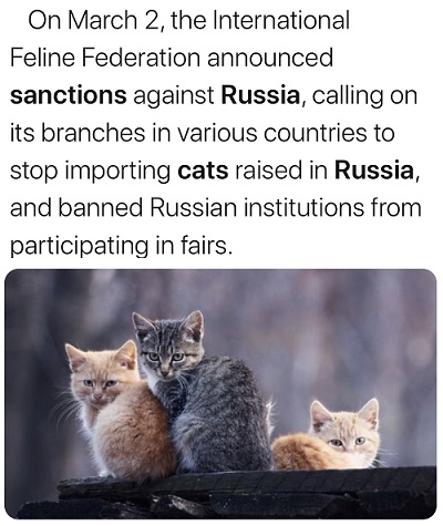 FX168财经报社(香港)讯 俄罗斯入侵乌克兰后引发国际谴责,多国政府及团体宣布对俄罗斯展开各种形式的制裁。眼下连俄罗斯的猫也成为制裁对象,猫科动物国际联合会(FIFe)加入制裁俄罗斯的行列,宣布自3月1日起,各国分会停止进口饲养于俄罗斯境内的猫,禁止与俄罗斯有关的组织参加猫科动物国际联合所举办的展会和比赛。