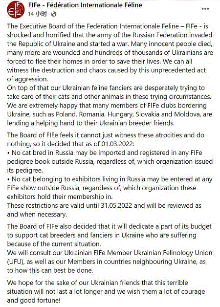 FIFe发表声明,对乌克兰局势感到“震惊和恐惧”,称战事除造成人员伤亡外,身在乌克兰的猫科动物爱好者伙伴们也在艰难环境中拼命照顾他们的猫和其他动物。
