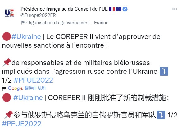 FX168财经报社(北美)讯 欧盟轮值主席国法国,当地时间周三(3月2日)在推特上发推文宣布,欧盟决定以支持俄罗斯对乌克兰的特别军事行动为由,对白俄罗斯实施制裁。