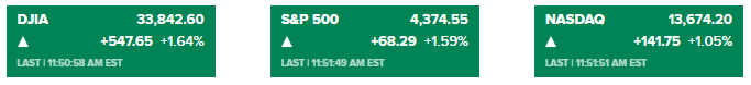 美股三大股指强势反弹:道琼斯指数上涨约550点或1.6%,标普500指数上涨1.6%,以科技股为主的纳斯达克综合指数上涨超1%。