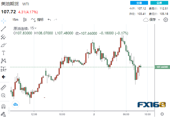 WTI原油短线加速走低至105.18美元低点,此前一度涨超8%至112.51美元。