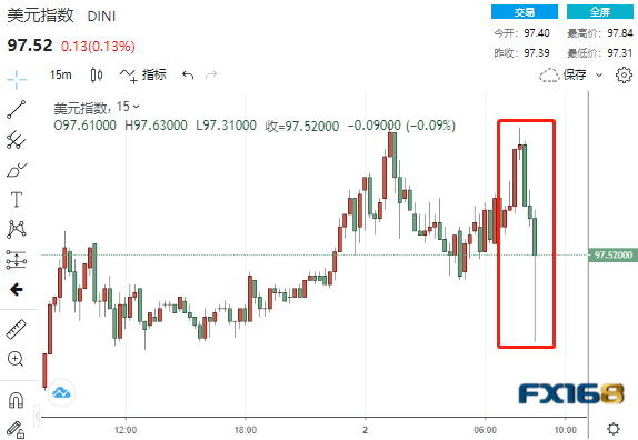 鲍威尔在国会作证期间,美元指数DXY短线走高20点至97.83,但随后很快自高位大幅回落至97.31。
