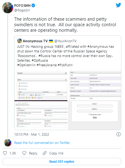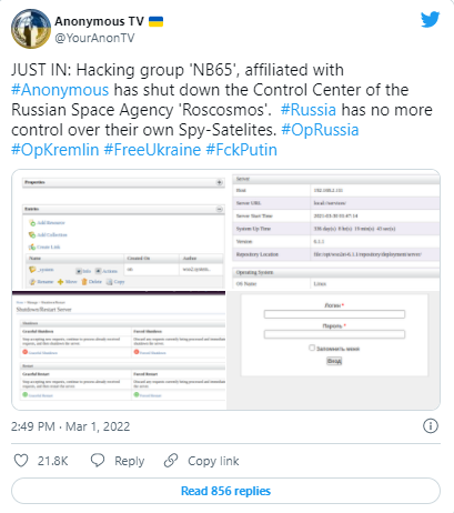 周二下午,“匿名者”在推特上宣布,隶属于匿名者底下的一个分支骇客团队“NB65”,目前已经成功瘫痪宇航局太空总署的控制中心,目前俄罗斯已经无法与自己的间谍卫星取得联系与控制,形同让俄国间谍卫星失能。