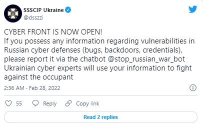 乌克兰也在为自己的网络攻击做准备。乌克兰国家特殊通信和信息保护局(SSSCIP)在推特上呼吁任何有“俄罗斯网络防御漏洞”信息的人报告这些漏洞,并表示“乌克兰网络专家将使用你们的信息与占位者作战。”
