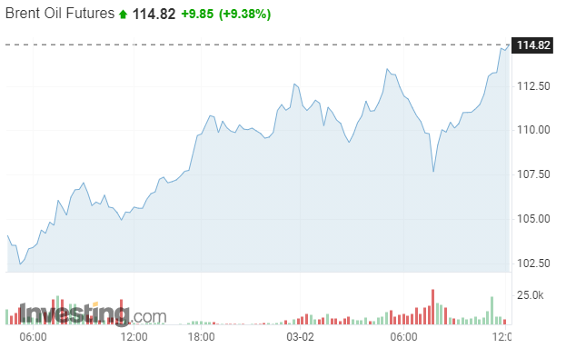 受这一消息提振,布伦特原油期货在市场收盘后触及115美元/桶,为2008年以来首次,日内大涨超9%。