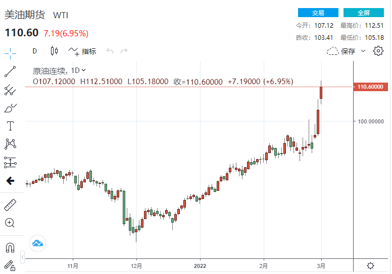 截至发稿,美国WTI原油期货上行4.88美元,涨幅4.59%,现报111.24美元/桶;布伦特原油期货上探7.18美元,涨幅6.72%,报114.46美元/桶。