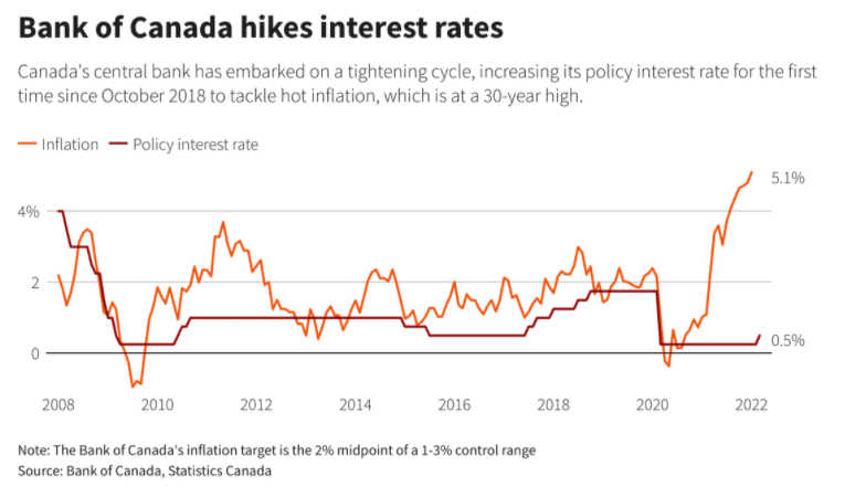 在新冠大流行期间,加拿大隔夜利率目标大部分时间保持在0.25%,这次调整将下限上调25个基点,这也是央行自2018年10月以来的首次加息。加拿大央行表示将继续其债券购买计划的再投资阶段。在发布该决定的同时附着的一份央行的声明称,乌克兰战争是“一个新的主要不确定性来源”,它正在推高石油和其他商品的价格。这次的加息也为 4 月进一步加息奠定了基础。