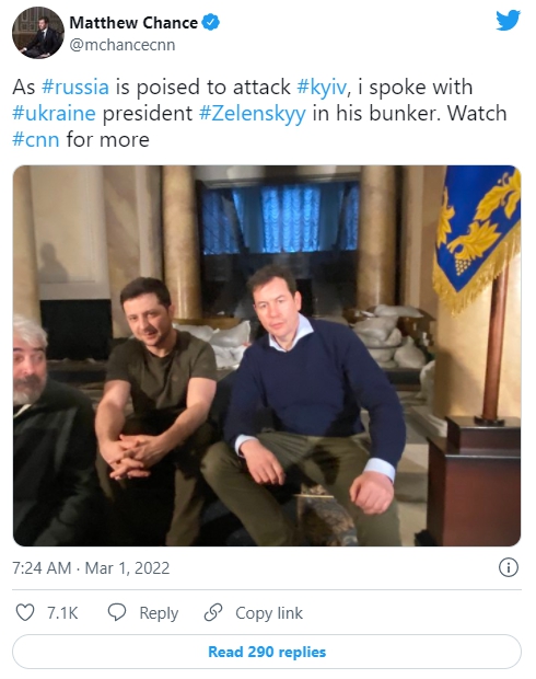 泽连斯基据称在基辅市中心的一个秘密地点。他说,他们必须先与乌克兰军队见面,乌克兰军队用车辆把他们带到市中心一座建筑的地下室,沿着长长的、黑暗的走廊,走廊上放满了沙袋。