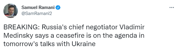 FX168财经报社(香港)讯 俄罗斯与乌克兰的第二轮谈判逐渐明朗,据俄罗斯国际文传电讯社消息,俄罗斯谈判代表表示,将在与乌克兰代表团举行的会谈中讨论可能的停火协议。乌克兰方面也确认,将出席第二轮谈判。