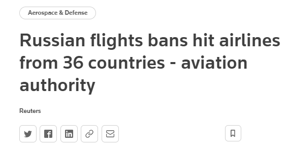 据报道,当地时间3月2日,美国正式宣布对俄罗斯飞机关闭领空。在此之前,欧盟、加拿大也采取了类似举措。作为回应,俄罗斯宣布对包括欧盟全部27个成员国在内的36国飞机关闭领空。