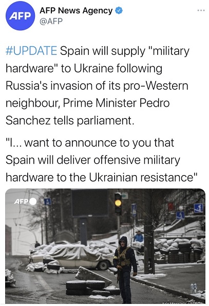 当地时间3月2日早些时候,西班牙首相桑切斯(Pedro Sanchez)在众议院全体会议中宣布,该国将向乌克兰提供进攻性军事物资。
