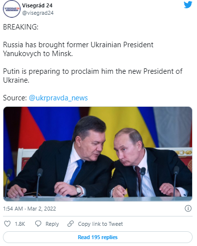 FX168财经报社(北美)讯 周三(3月2日),据乌克兰情报机构称,在逃的乌克兰前总统亚努科维奇目前在明斯克,克里姆林宫正在为他准备一项特别行动。