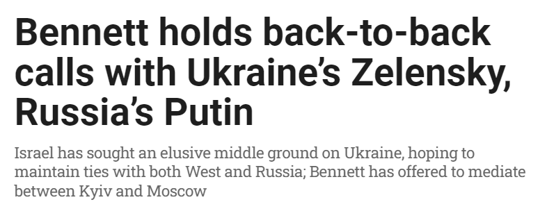 谈到以色列,据俄罗斯卫星通讯社2月26日援引乌克兰独立新闻社(UNIAN)消息,泽连斯基早前就曾请求贝内特担任乌克兰与俄罗斯谈判的调解人。消息表示,泽连斯基本人已经向以色列方面发出了请求。
