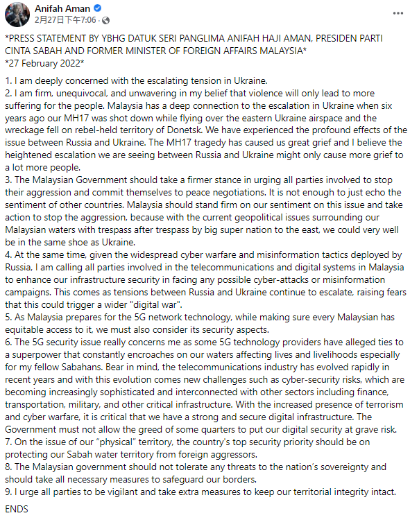 对于官方暧昧不明的立场,马来西亚前外交部长阿尼法阿曼(Anifah Aman)也在脸书撰文指出,呼吁官方坚定表达反侵略立场。根据《当今大马》报道,阿尼法提醒马来西亚也可能会遭到大国的伤害,尤其在南海主权争议上,也可能发生如今乌克兰的局面。