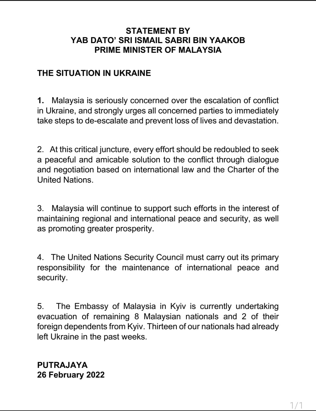 俄罗斯在2月24日派军入侵乌克兰,引起国际社会的强烈谴责,不过在东协成员国中,除了印尼和新加坡对俄罗斯表达强烈谴责的立场外,其它东协国家则发出措辞不强烈的外交表态,其中包括马来西亚。2月26日,在柬埔寨访问的马来西亚首相依斯迈·沙比里(Ismail Sabri)在记者会表示,马来西亚政府密切关注俄乌冲突,并称“东协作为一个自由国家组织,我们同意不干预国外发生的问题。”