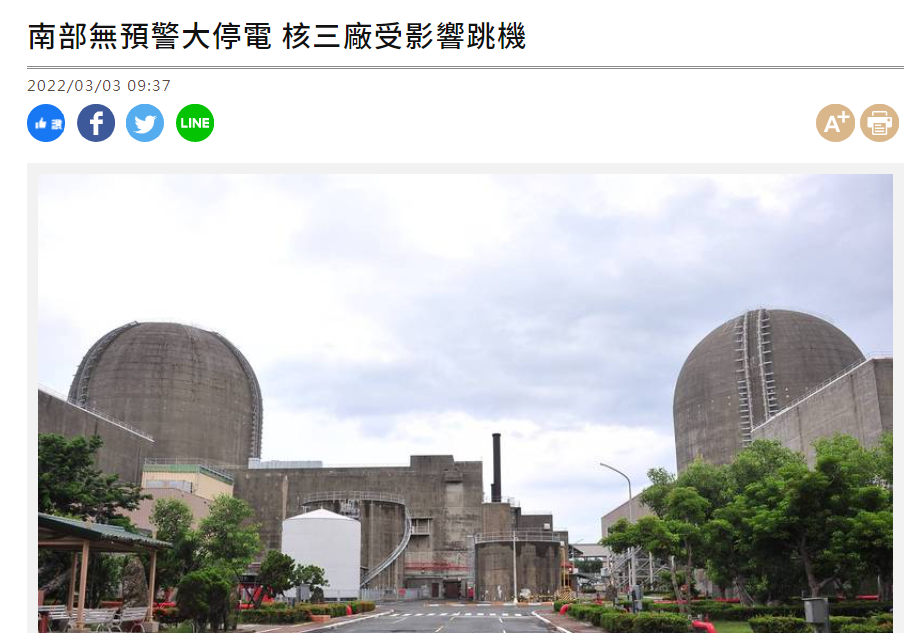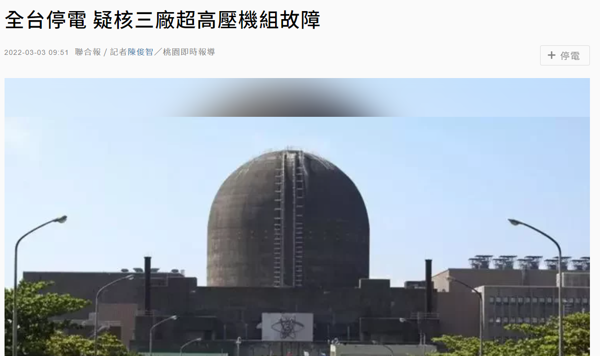 FX168财经报社(香港)讯 全台湾3日早晨突然传出无预警停电,位在恒春的台电核3厂,疑似受到外部电源突然断链的影响,两部机组突然跳机。但目前仍未发现核能外洩状况,而全台供电恐受影响。