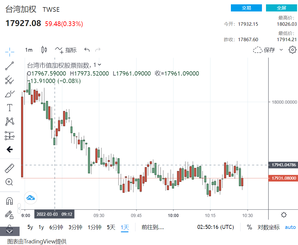 FX168财经报社(香港)讯 美国股市2日纽约收盘录涨幅,投资者原预计亚市早盘将呈现大好行情。3日开盘后,台股先是朝上涨,但随着9时后全台湾出现大停电,盘中也出现几近90度直角向下急杀,约从高档17993点急挫至17931点,估逾60点的急杀盘窘境。