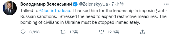 泽连斯基在推特表示,已经与加拿大总理特鲁多通过电话,感谢后者在制裁俄罗斯方面,发挥出领导的作用。他也同时强调,有必要扩大制裁手段。