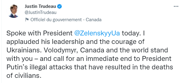 杜鲁多则对乌克兰表达赞扬,他认为泽连斯基勇敢站在前线领导人民,鼓舞加拿大与世界各地的人民。他强调,俄罗斯无理、非法入侵乌克兰领土,须为此负起责任。