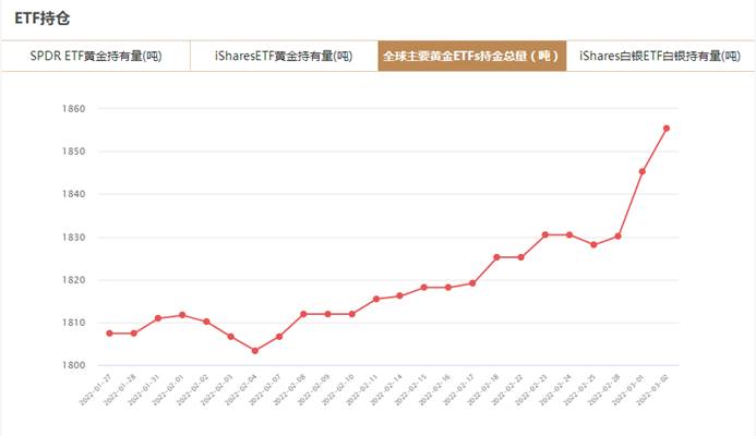 根据黄金信息网站www.24K99.com对全球8大主要黄金ETF的监控数据显示,截至2022年3月2日,全球8大黄金ETFs持仓总量为1855.397吨,与上一交易日增加10.12吨。