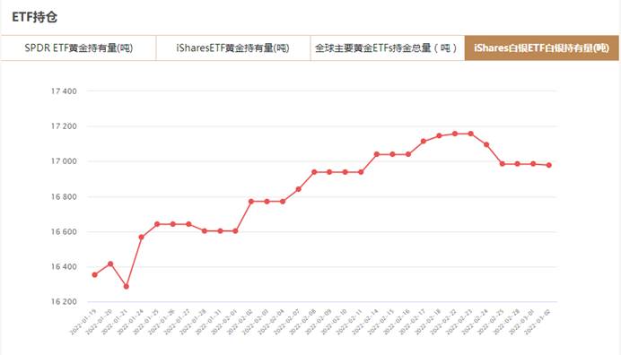 iShares白银ETF3月2日白银持有量为16977.97吨,与上一交易日减少6.17吨。
