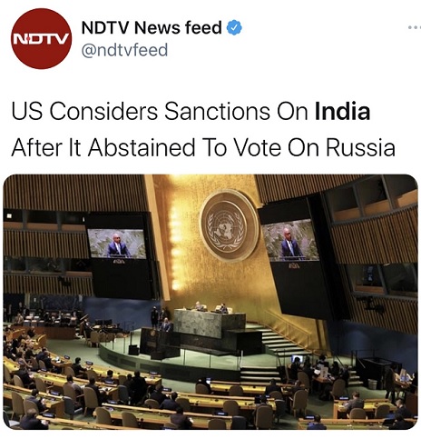 印度亚洲国际新闻社周四报道称,就在3月2日,印度在联合国大会紧急特别会议上就乌克兰局势决议草案投下弃权票一事,招致了听证会上美国两党议员的批评。美国政府尚未对制裁一事作出决定。