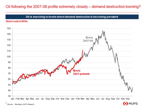 三菱日联金融集团(MUFG)分析显示,布伦特原油价格飙升的轨迹与2007-08年如出一辙,当时油价曾触及150美元/桶的创纪录高点,随后需求锐减,价格在全球经济衰退中暴跌。