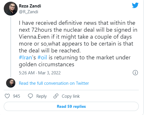 据伊朗石油记者Reza Zandi,收到决定性消息称,未来72小时内核协议将在维也纳签署。即使可能需要几天左右的时间,但似乎可以确定的是协议将会达成。