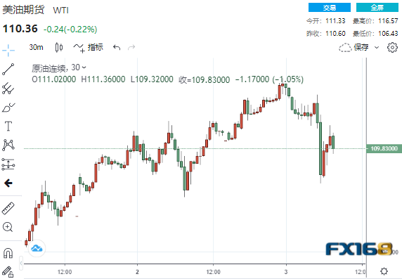 消息传来之后,WTI原油期货短线迅速跳水至106.43美元/桶低点,较日高回落逾10美元。 布伦特原油日内大跌4.00%,至109.63美元/桶,较日高回落约10美元。