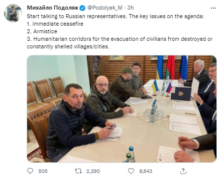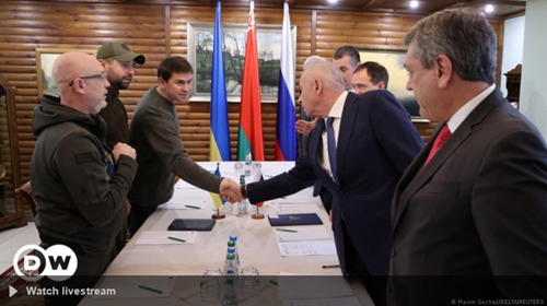 在莫斯科入侵部队包围和轰炸乌克兰城市之际,乌克兰谈判代表周四与俄罗斯官员举行会谈,要求双方停火,并建立人道主义走廊撤离被围困的公民。