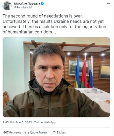 “第二轮谈判已经结束。不幸的是,乌克兰需要的结果尚未实现,”乌克兰谈判代表、总统顾问波多里亚克在推特上说。