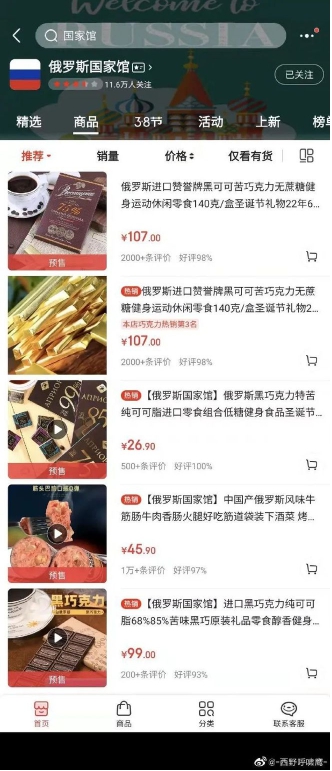 据报道,最近,有不少中国网友选择到俄罗斯驻华大使馆唯一授权的电商平台“俄罗斯(Russia)国家馆”购物,将店内的各类零食、茶叶都“洗劫一空”,热门商品甚至被买到显示为“预售商品”,店铺的粉丝量也在暴涨。