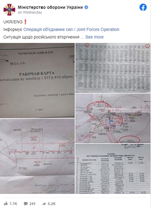 乌克兰国防部表示,被缴获的文件被发布在Facebook上,显示了俄罗斯黑海舰队第810独立卫队海军步兵旅的一个营战术小组的作战计划。