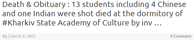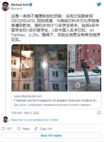 报道指出,俄军朝哈尔科夫国立文化学院宿舍开火,哈尔科夫军民局也报告了这个情况。目前已确认姓名的死者,除了上述两名中国留学生外,还有乌克兰学生Oleg Teplovy和 Yegor Lundik,哈尔科夫医药大学的印度留学生Navin Shekharapa Gyanagudar。