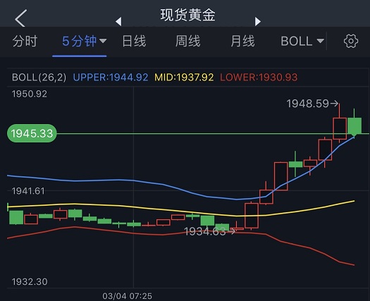 现货黄金短线急涨,金价已经突破1945美元/盎司,目前最高触及1948.59美元/盎司。