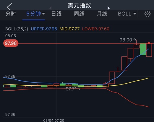 避险情绪升温推动美元兑其他货币上涨。美元指数一度触及98,日内涨0.29%。欧元/美元短线跌幅扩大,最低至1.1021,30分钟累计下跌40点。